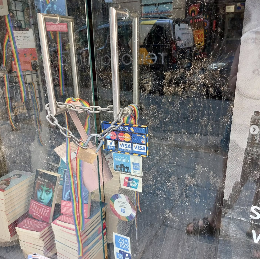 La mañana de este jueves, la librería Berkana, emblema de la cultura LGTBIQ+ desde la capital española, apareció vandalizada en sus calles de Madrid. Las imágenes compartidas por sus propietarias mostraban que su escaparate había sufrido daños y alguien había arrojado líquido sobre los cristales.