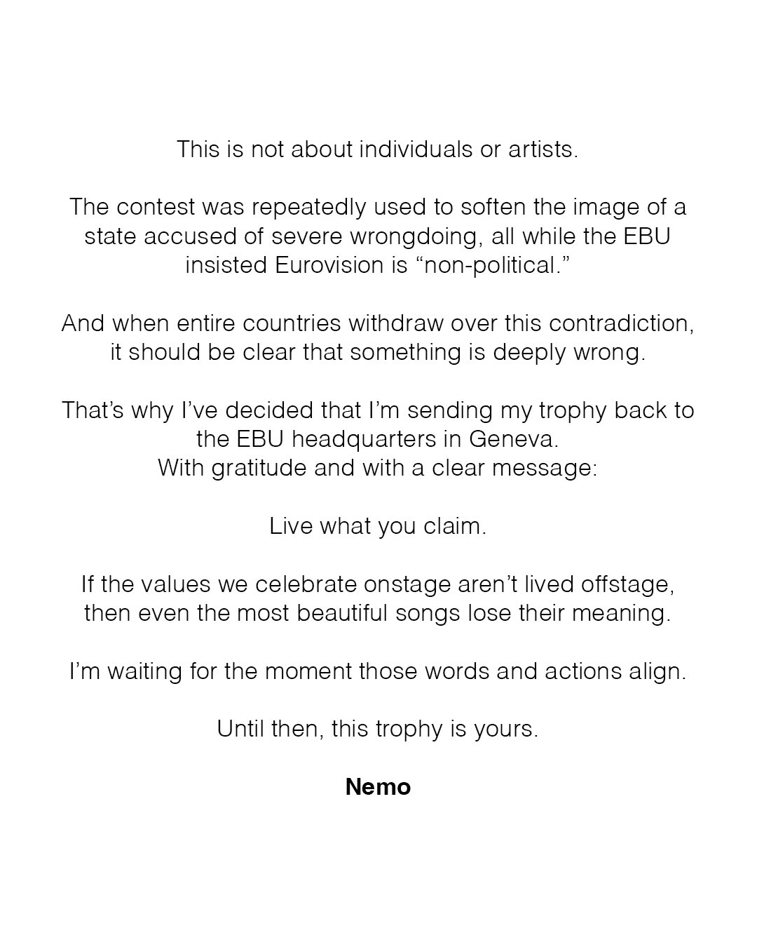 Siguiendo la noticia de Islandia, así lo ha comunicado Nemo a través de un post publicado en sus redes sociales: “El año pasado gané Eurovisión y con ello me otorgaron el trofeo. Y aunque estoy inmensamente agradecido por la comunidad que rodea a este concurso y por todo lo que esta experiencia me ha enseñado como persona y como artista, hoy siento que este trofeo ya no pertenece a mi estante. Eurovisión dice que representa la unidad, la inclusión y la dignidad para todos. Esos valores hicieron que este concurso fuera significativo para mí. Pero la participación continua de Israel, durante lo que la Comisión Internacional Independiente de Investigación de la ONU ha concluido como un genocidio, muestra un claro conflicto entre esos ideales y las decisiones tomadas por la UER”.