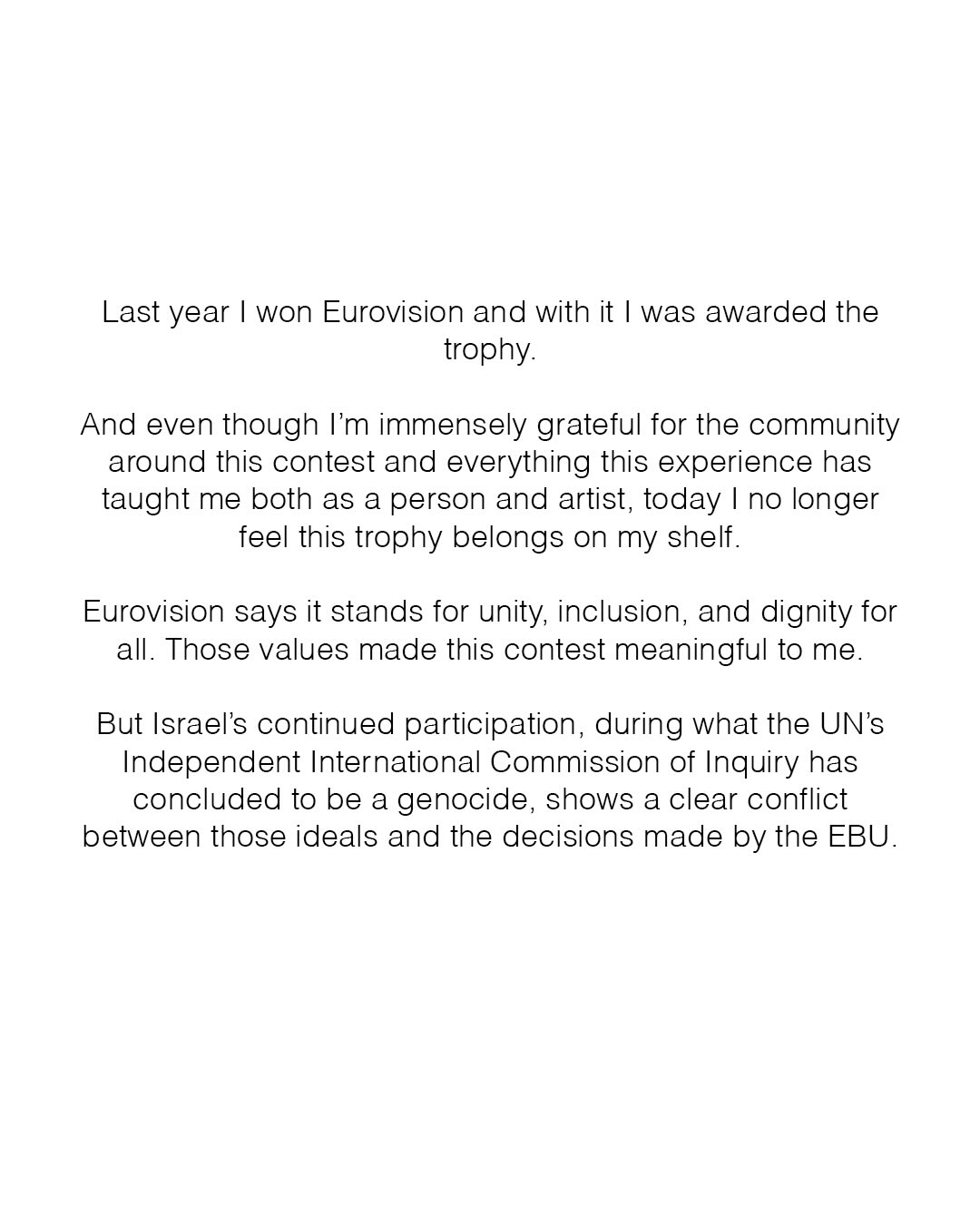 “El concurso se utilizó repetidamente para suavizar la imagen de un estado acusado de graves irregularidades, mientras que la UER insistía en que Eurovisión es “apolítica”. Y cuando países enteros se retiran por esta contradicción, debería quedar claro que algo anda muy mal. Por eso he decidido devolver mi trofeo a la sede de la UER en Ginebra. Con gratitud y con un mensaje claro: Vive lo que proclamas”.